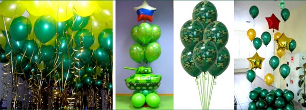Воздушные шары сейчас бывают всех цветов и оттенков, поэтому, думаю, не так сложно подобрать зеленую гамму, которая у всех присутствующих будет ассоциироваться с камуфляжной одеждой наших солдат.